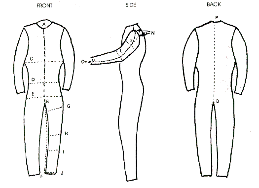 As Per Chart: C: Chest...............................__________ D: Waist...............................__________ E: Hips................................__________ F to B: Inside Leg (to end overall).........__________ O to N: Outside Arm.........................__________ (shoulder seam to end of overall - inside arm is no good) A to B: Centre of Crotch to collar - Front..__________ P to B: Centre of Crotch to collar - Back...__________ (A total measurement is no good) |